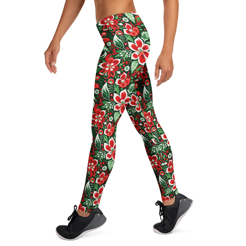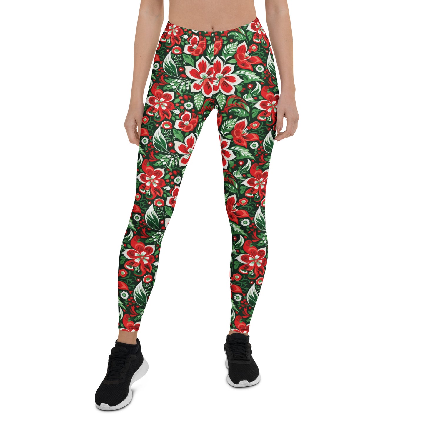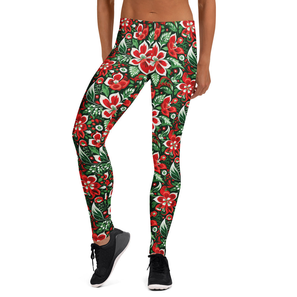 Bright Red Mexican Flowers Pattern Leggings are printed in USA