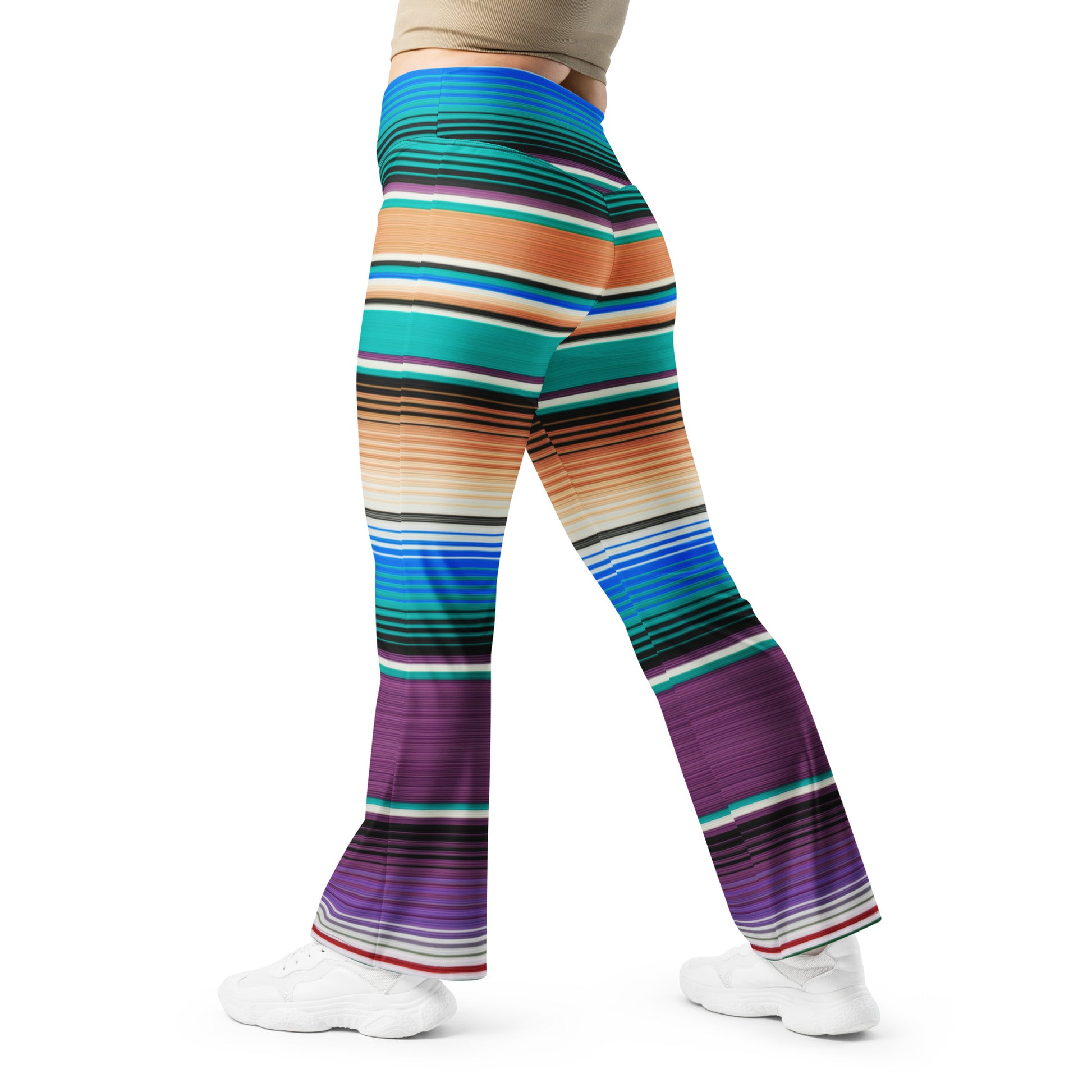 Shades of Purple y Green Mexican Serape Printed Flare leggings are printed in USA