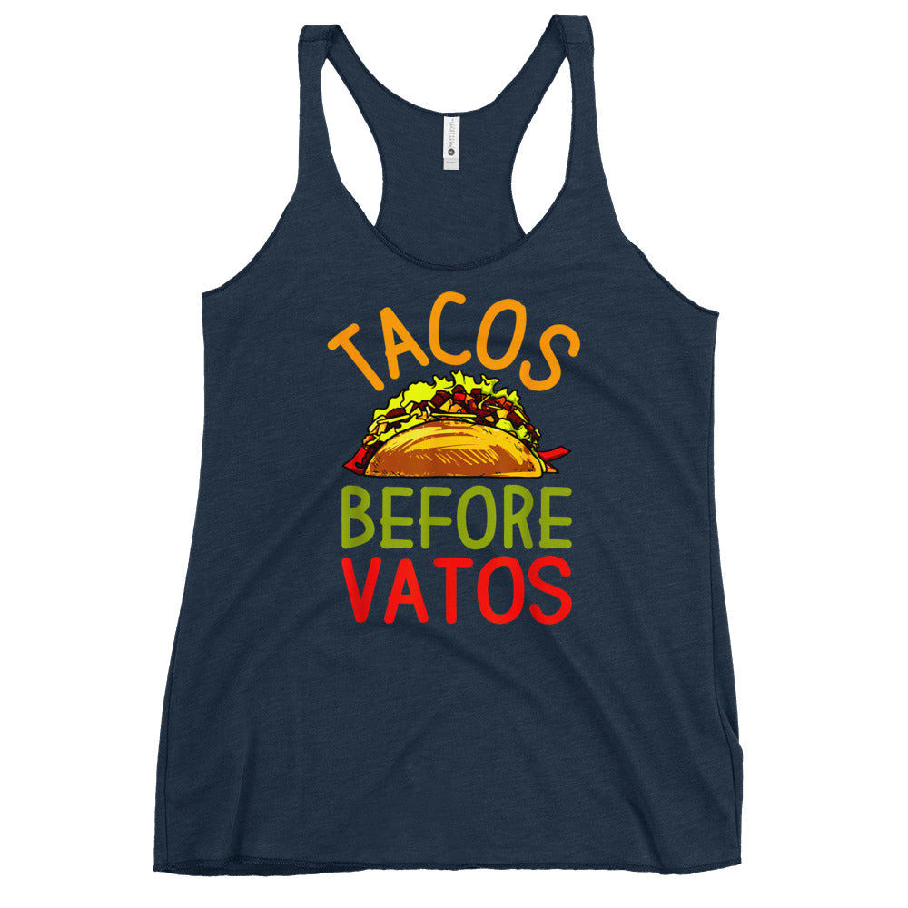 Tacos Before Vatos Women's Racerback Tank Tops are printed in USA