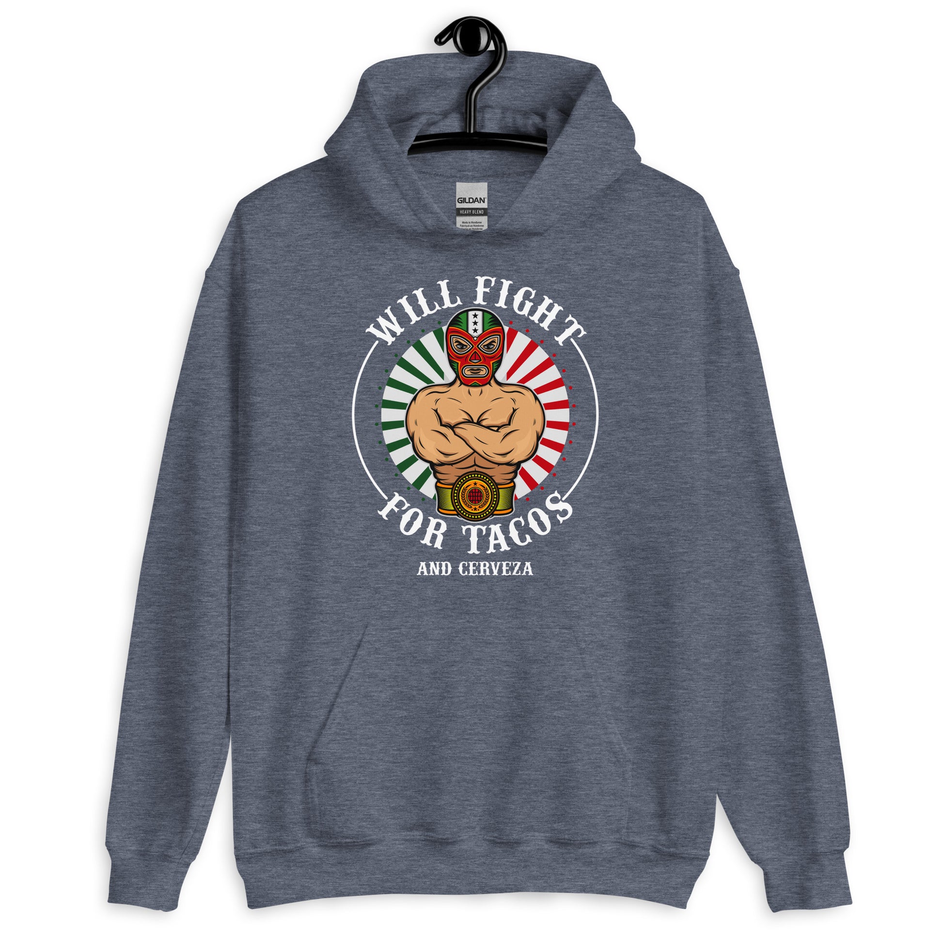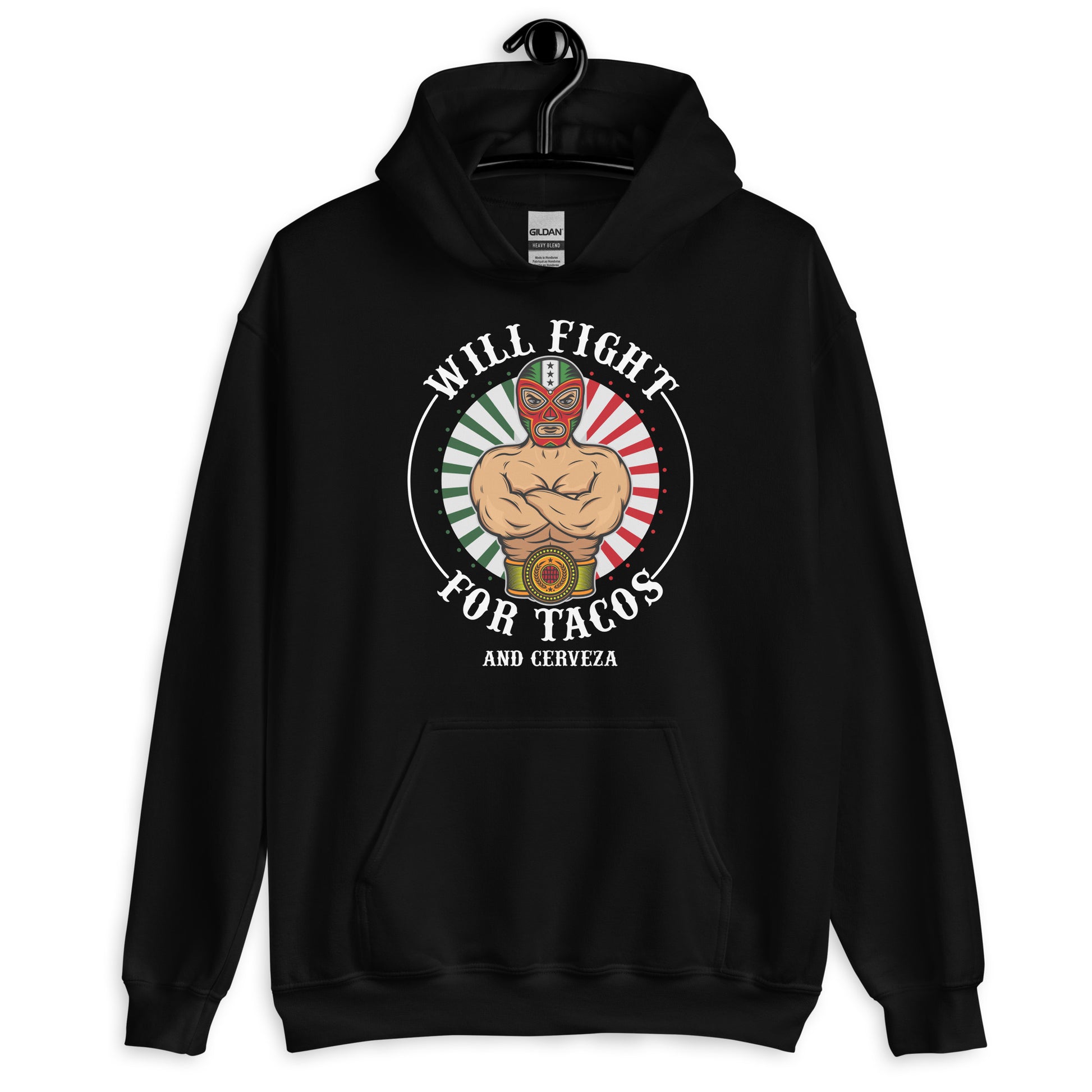Will Fight for Tacos and Cerveza Luchador Unisex Hoodies are printed in USA